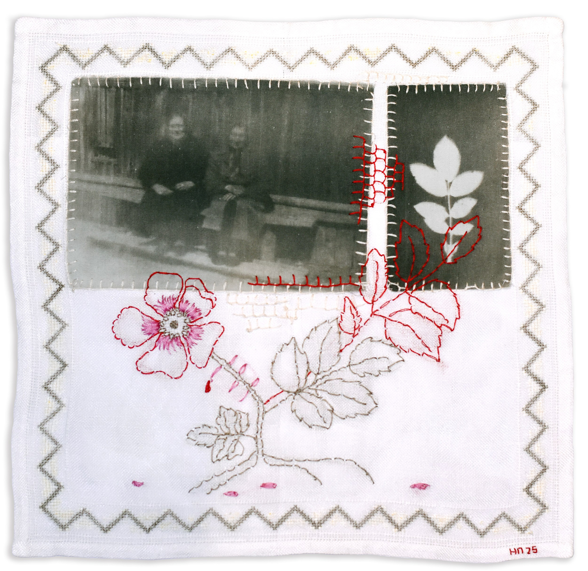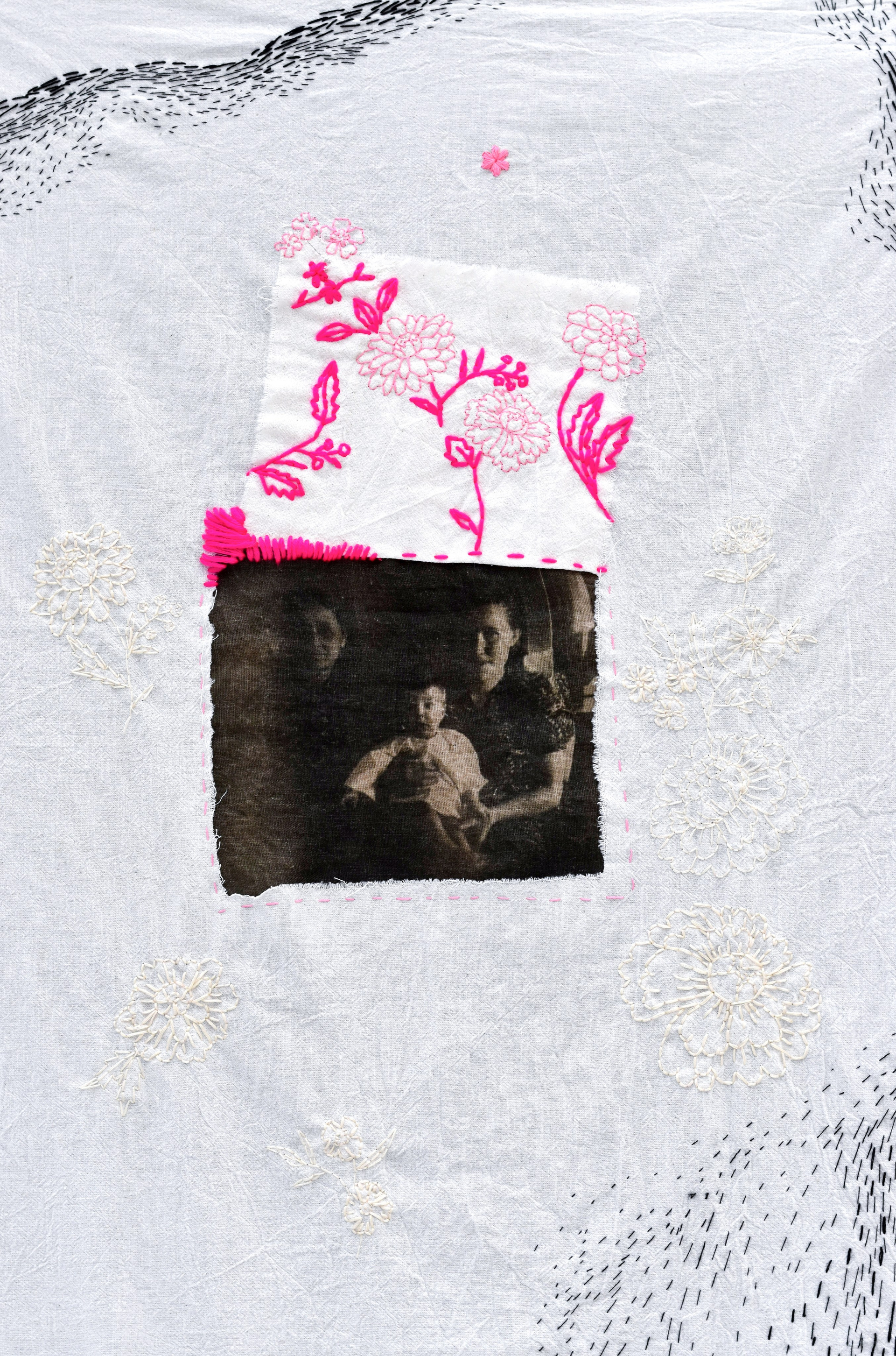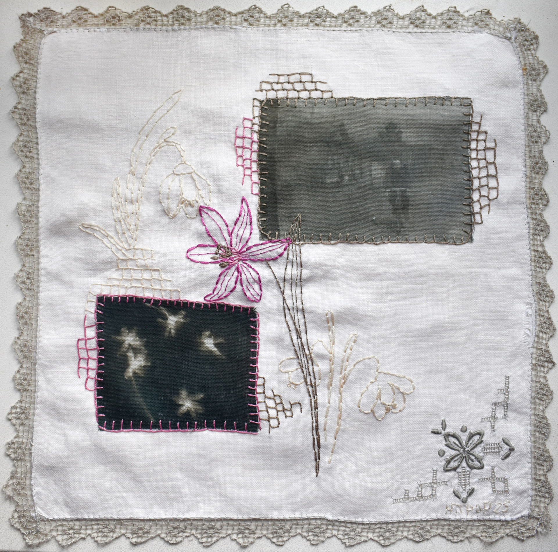 "Подснежник" из серии «Весна» (в процессе) -На винтажных салфетках вышиты цветы и пришиты фотографии. Это фото из семейного архива, перенесенные на ткань методом цианотипии. На снимках мои родственники, с которыми в реальности я была не знакома или знала их только в раннем детстве. Я всегда очень жалела, что у меня нет возможности их узнать. В своих работах я пытаюсь придумать несуществующие воспоминания о родных с помощью снимков из альбома, создать близость, которую я не успела получить в реальности. В процессе их создания, я как будто знакомилась и общалась с близкими людьми, узнавала их. Также, я использую символику цветов, передающих чувства, которые я так или иначе связываю и ассоциирую с моими родными и тем, что они пережили в жизни.