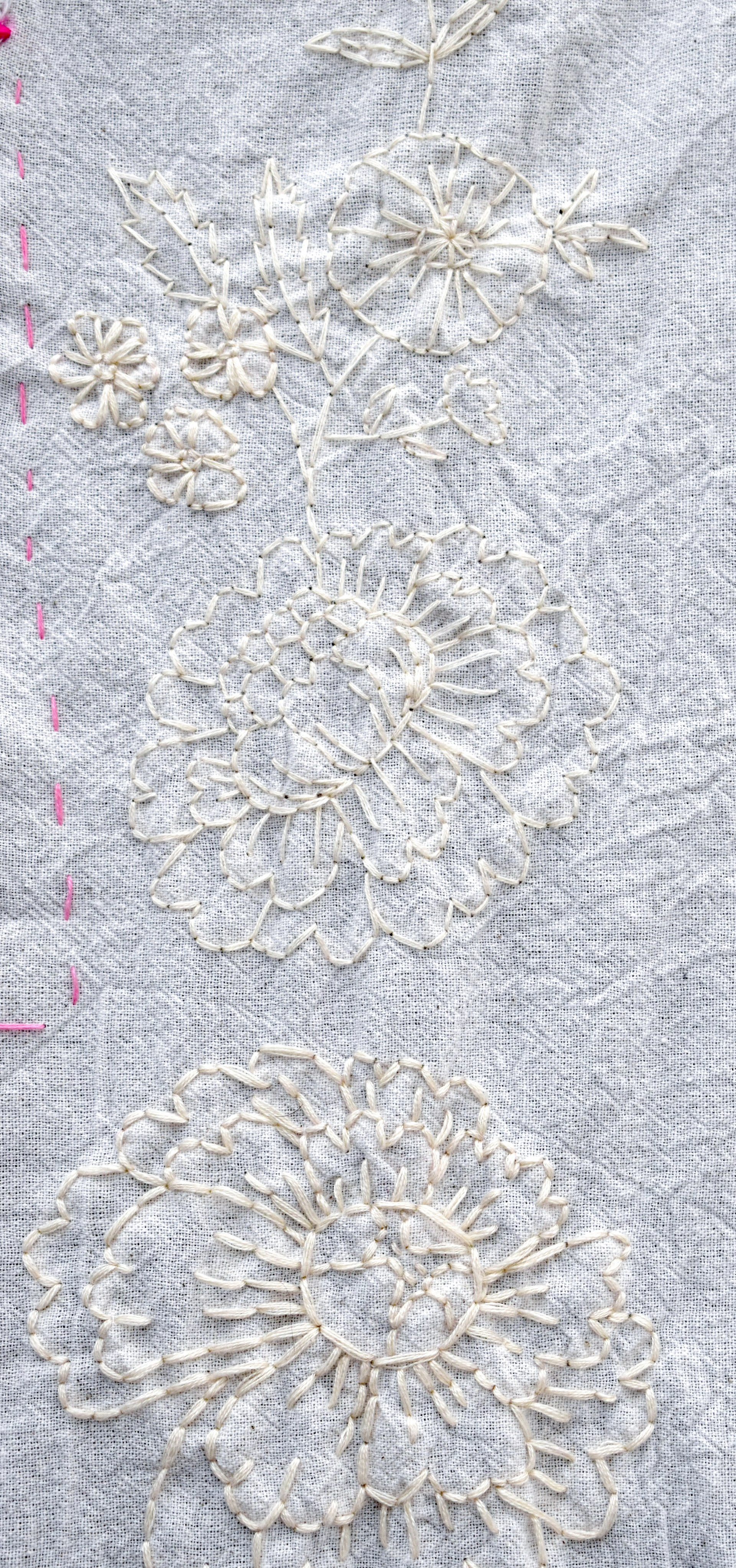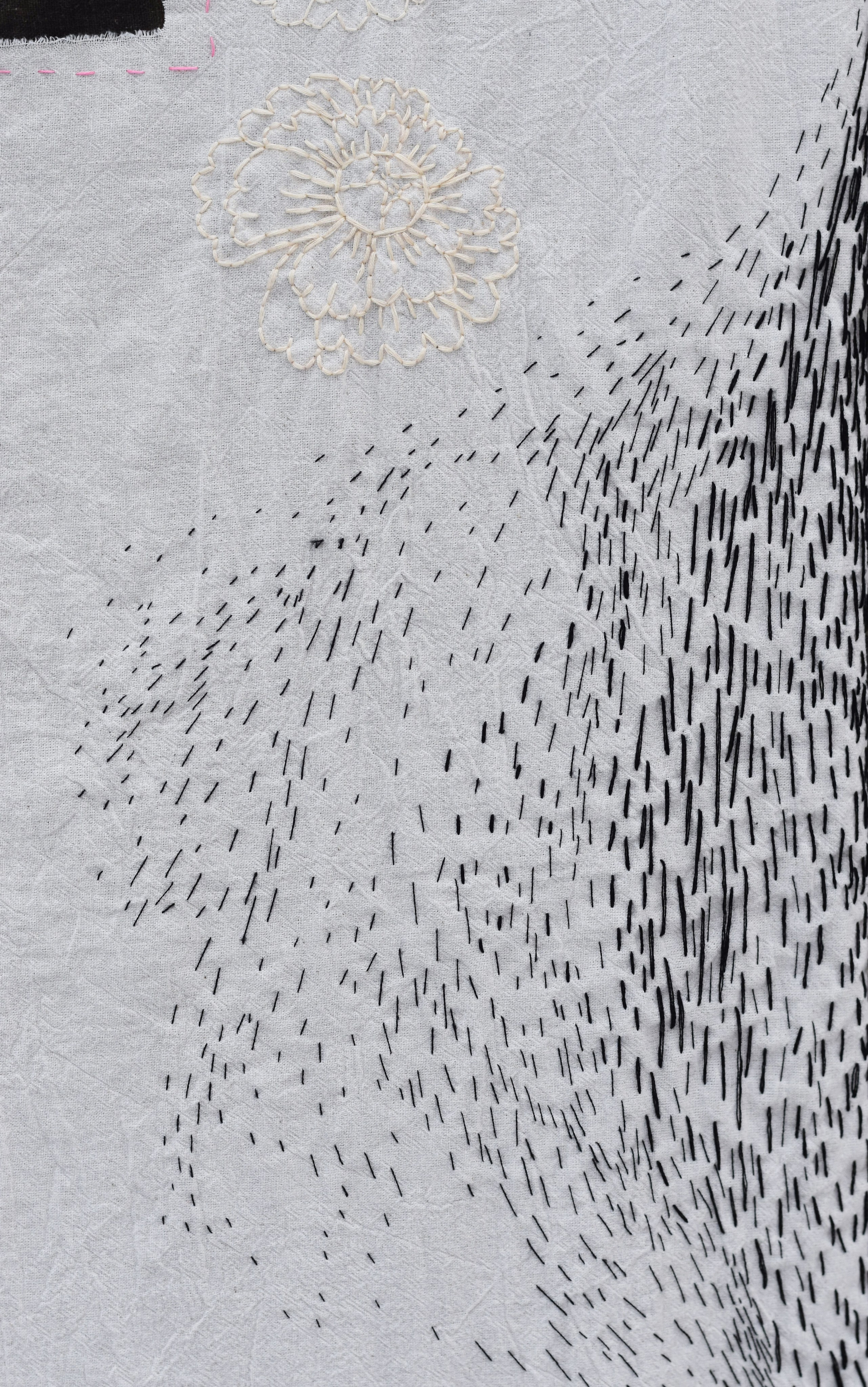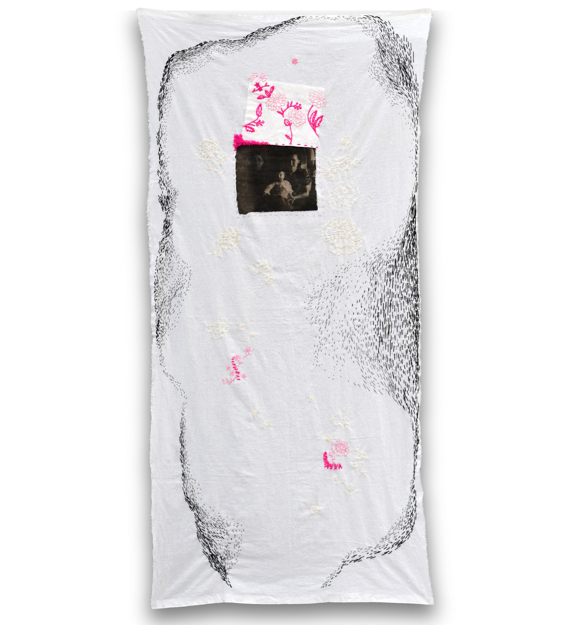 "Подснежник" из серии «Весна» (в процессе) -На винтажных салфетках вышиты цветы и пришиты фотографии. Это фото из семейного архива, перенесенные на ткань методом цианотипии. На снимках мои родственники, с которыми в реальности я была не знакома или знала их только в раннем детстве. Я всегда очень жалела, что у меня нет возможности их узнать. В своих работах я пытаюсь придумать несуществующие воспоминания о родных с помощью снимков из альбома, создать близость, которую я не успела получить в реальности. В процессе их создания, я как будто знакомилась и общалась с близкими людьми, узнавала их. Также, я использую символику цветов, передающих чувства, которые я так или иначе связываю и ассоциирую с моими родными и тем, что они пережили в жизни.